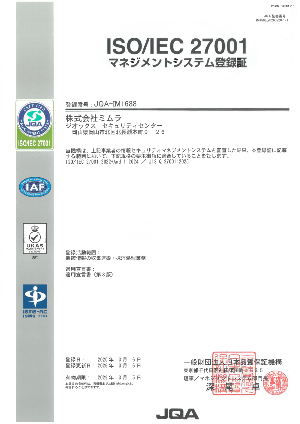 経済産業省の外郭団体でISO9000シリーズや14001の審査機関でもある一般財団法人 日本品質保証機構(JQA)が、機密文書等のリサイクル処理施設の安全性を耐火基準等の施設構造安全基準まで含めた外部より保証する国内唯一の規格。 |